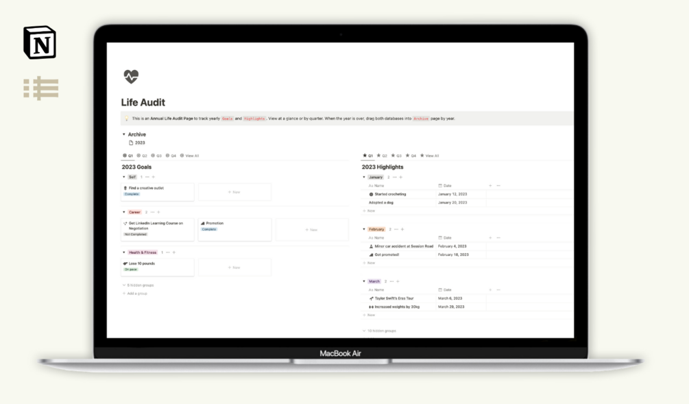Get this FREE Life Audit template to set goals in different aspects of your life and log life’s highlights as they come for the entire year. Then do it again next year.