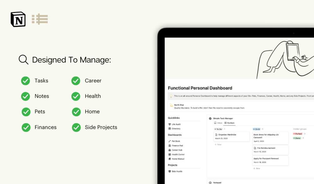 This is an all-around Personal Dashboard to help manage different aspects of your life—Pets, Finances, Career, Health, Home, and any Side Projects. Front and center is a Task Manager and a Notepad to serve as a Commonplace Book.